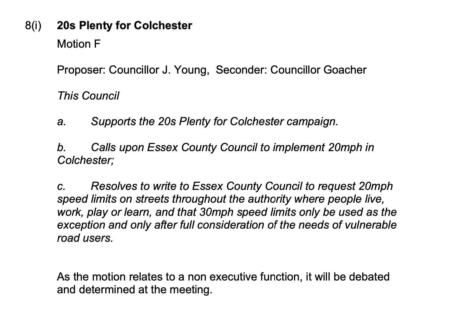 The council agenda also includes plans for development at Middlewick. The 20mph lobby is likely to be outnumbered!