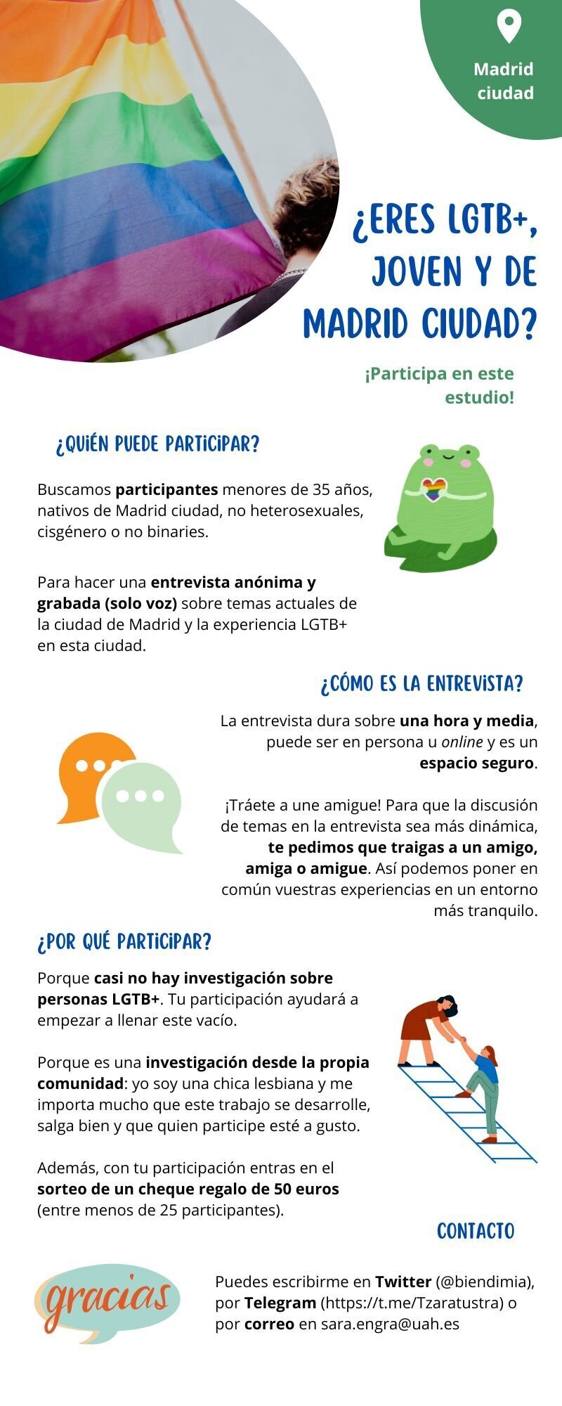 ¿Eres de Madrid ciudad, LGTB+ y menor de 35 años? ¡Participa en este estudio! Consiste en hacer una entrevista sobre temas actuales de la ciudad de Madrid y la experiencia LGTB+ en este espacio. Cómo es la entrevista: la entrevista dura una hora y media, puede ser en persona u online (adaptación absoluta a tus horarios y circunstancias) y es anónima y grabada. Además, te pedimos que traigas a une amigue de cualquier género para que tengamos más puntos de vista durante la conversación. La entrevista es un espacio seguro: la investigadora es lesbiana y tiene mucho interés en investigar a la comunidad LGTB+ desde la propia comunidad, pero aún más en que quien participe se encuentre a gusto hablando de sus vivencias. Por tomarte el tiempo de participar, entras en el sorteo de un cheque regalo de 50 euros entre menos de 25 participantes. Contacto: puedes escribirme en Twitter, Telegram o por correo a sara.engra@uah.es.