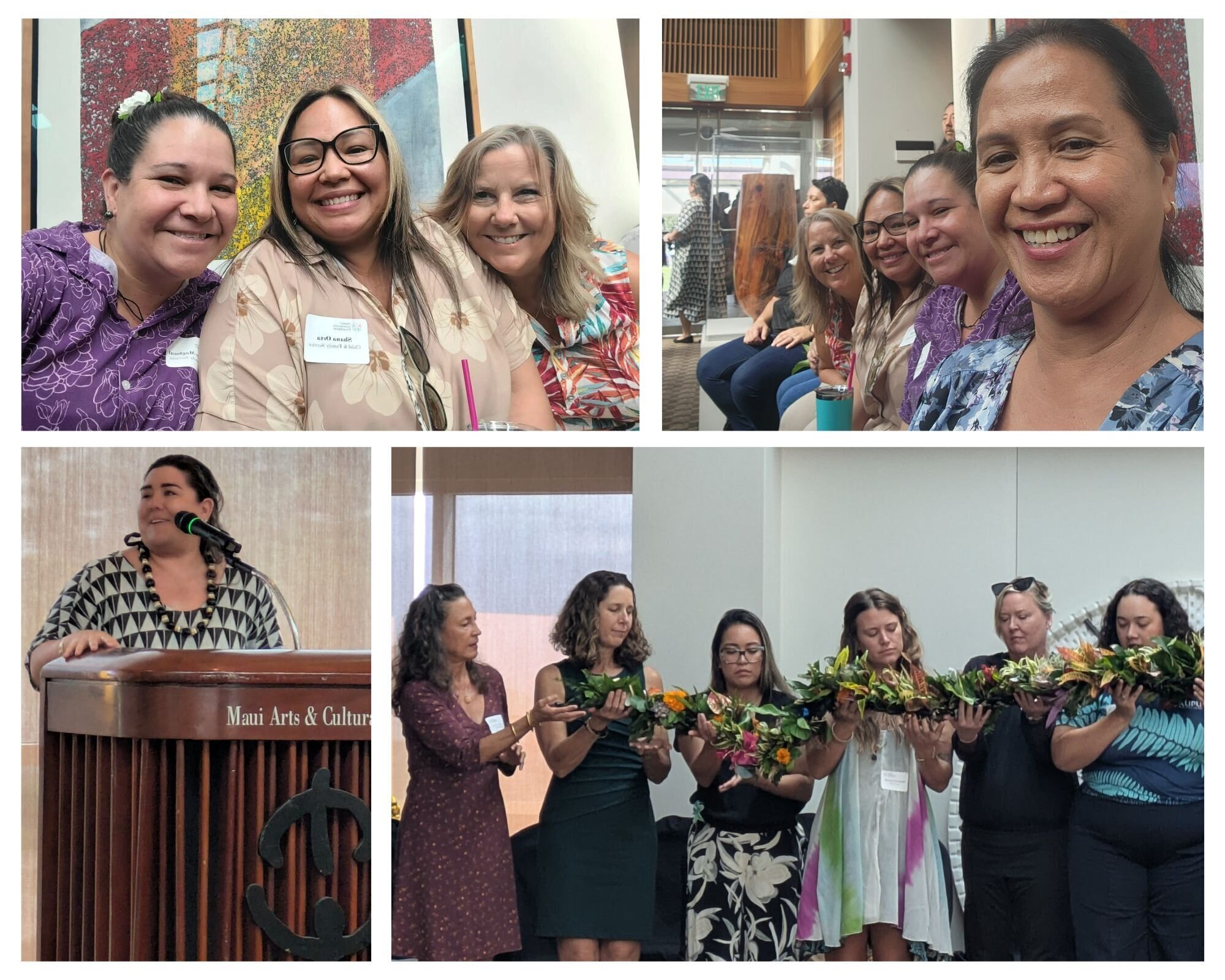 Pictured clockwise from top left: Mia Sado-Magbual and Shana Orta (Child & Family Service), Deb Marois (HP Coordinator), Edel Baguio-Larena (Maui Family Support Services); Kēhau Meyer (HCF); Maui Strong participants.