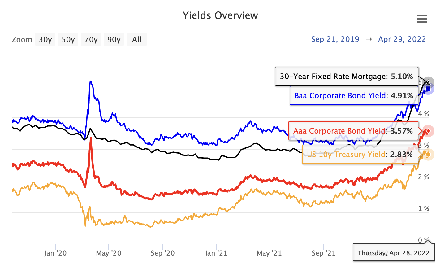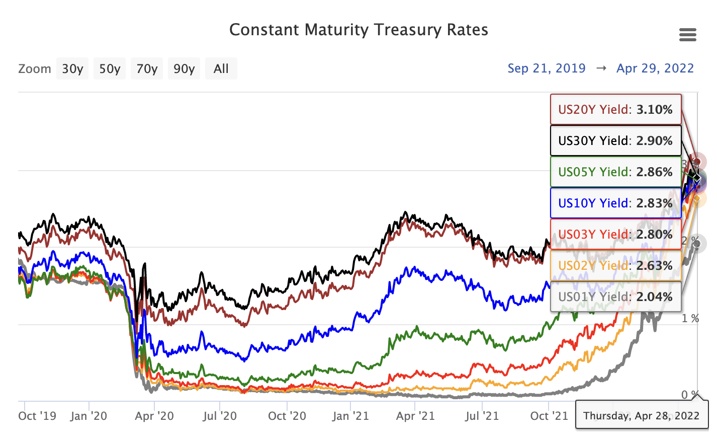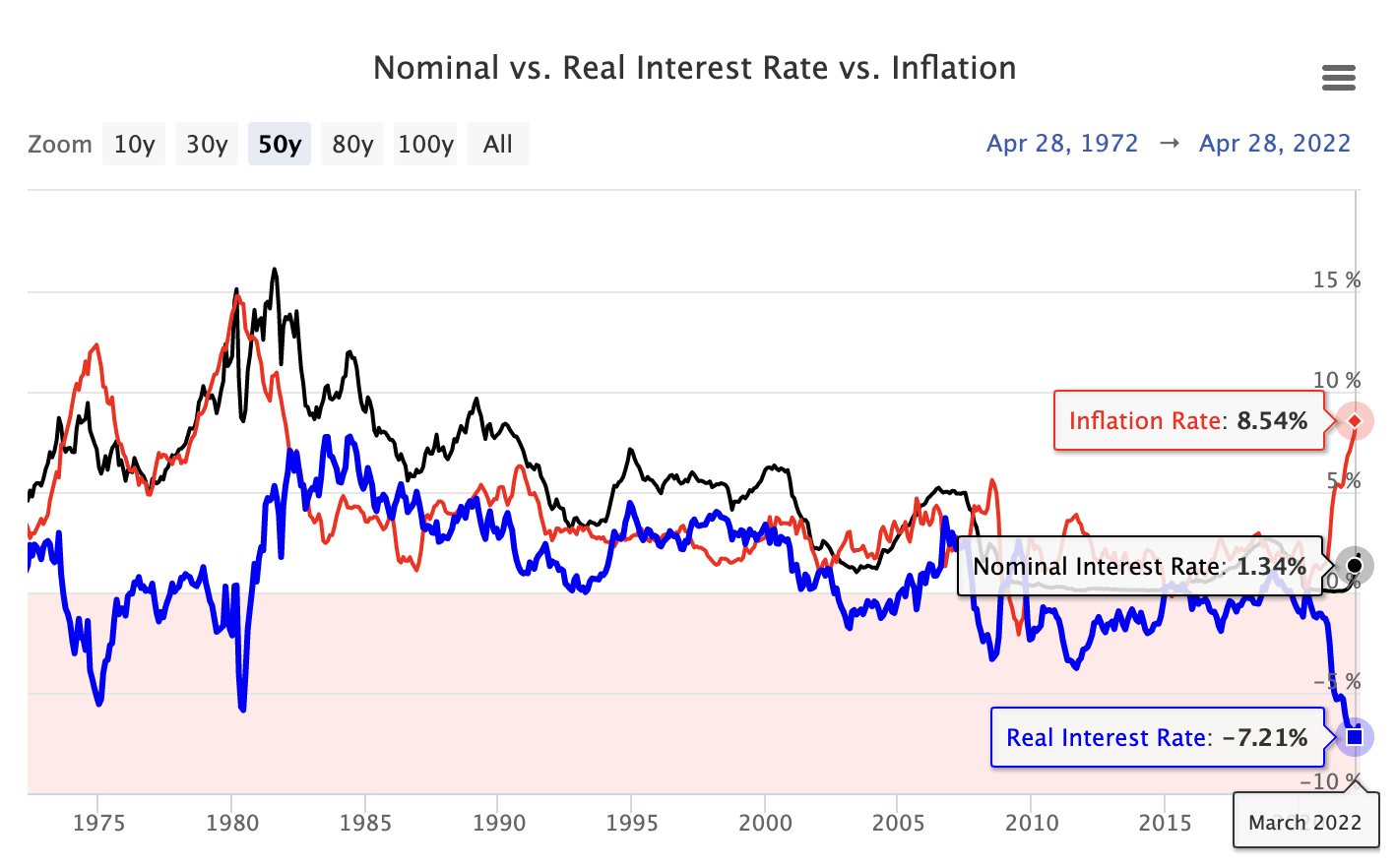The Real Interest Rate for a 1-year US Treasury bond dropped to -7.21%, which is the lowest reading since 1951. According to