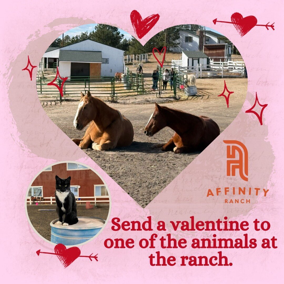 As we move into February, we are excited to offer a special opportunity to give back. You can send a Valentine's gift to your favorite animal by visiting our Colorado Gives Page, be sure to include the animal’s name in the dedication box. All proceeds will benefit our general animal fund. Additionally, when you visit the ranch, we will have Valentine card-making supplies available for you to create a card for an instructor, volunteer, animal, or anyone at Affinity Ranch who has made a difference in your life.