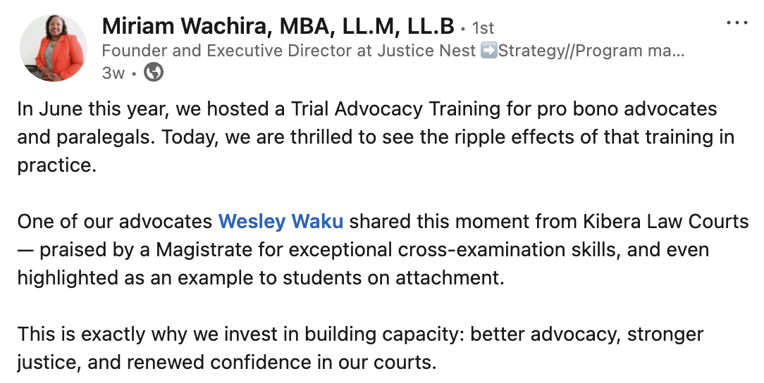 We are so proud to see Miriam's work with pro bono advocates and paralegals delivering stronger justice outcomes. Read the full LinkedIn post here.