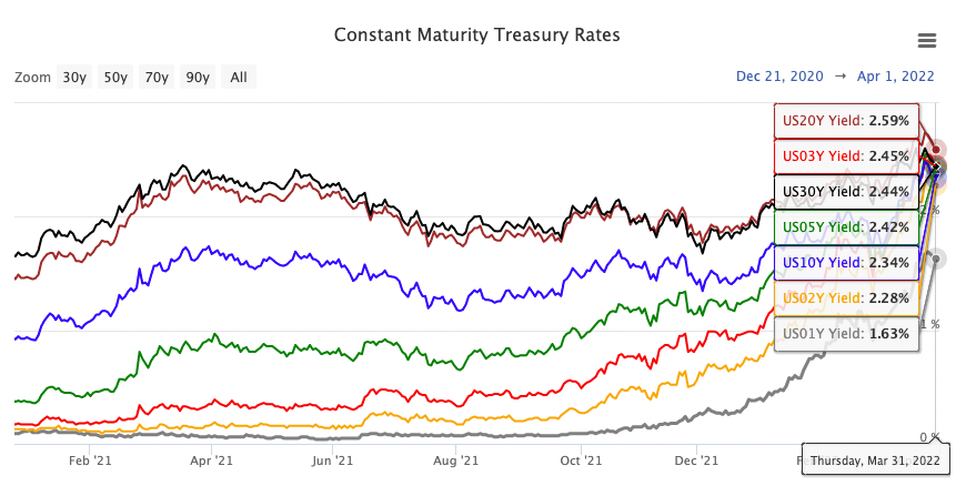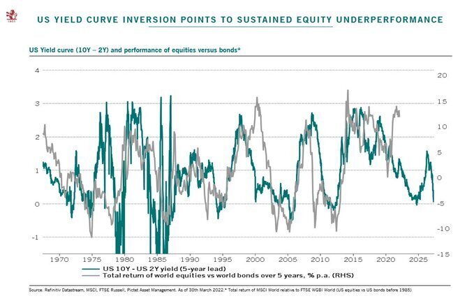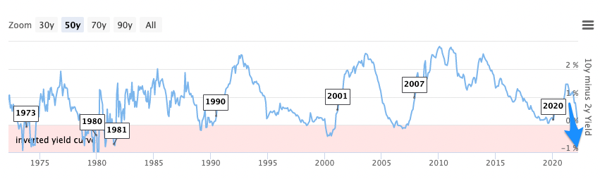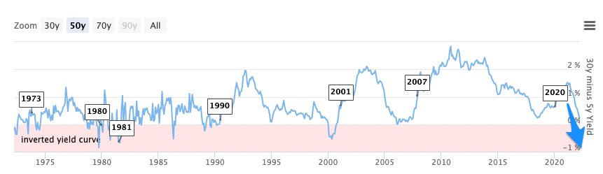Yield Curve inversion. When the yield curve inverts short-term interest rates are higher than long-term rates, which is often considered to be a