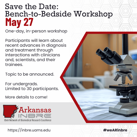 Save the Date: Annual Bench-to-Bedside Workshop. This annual one-day, in-person Workshop will be held on May 27. The target audience for this workshop is undergrads attending college/ university in Arkansas or Arkansas residents attending an out-of-state institution. Space for the workshop is limited and registration is required. Watch for more info after the beginning of the year!