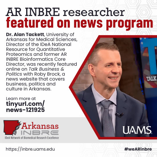 AR INBRE researcher featured on news program. Dr. Alan Tackett, University of Arkansas for Medical Sciences, Director of the IDeA National Resource for Quantitative Proteomics and former AR INBRE Research Technology Core Director, was recently featured online on Talk Business & Politics with Roby Brock, a news website that covers business, politics and culture in Arkansas. Tackett spoke about the new $10.5 million grant to the National Resource (see our Dec 5 newsletter), as well as the economic, health and research impacts to Arkansas and beyond. Video