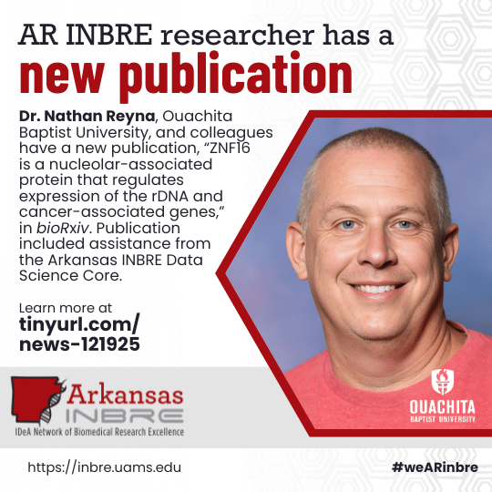 AR INBRE researcher has a new publication. Dr. Nathan Reyna, professor of biology at Ouachita Baptist University, and colleagues have a new publication, βZNF16 is a nucleolar-associated protein that regulates expression of the rDNA and cancer-associated genes,β in bioRxiv. Publication included assistance from Drs. Yasir Rahmatallah and Galina Glazko from the Arkansas INBRE Data Science Core (co-authors on the paper).