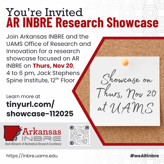 UAMS Showcase of Medical Discoveries focused on Arkansas INBRE. Arkansas INBRE is the feature of the next UAMS Research Showcase to be held on Thurs, Nov 20, 4 to 6 pm, at the Jack Stephens Spine Institute (12th Floor) (driving directions). Showcase will include 10 poster presentations: History of the EPSCoR/IDeA Programs, AR INBRE Overview/Administrative Core, DRPP Program, Research Technology Core, Bioinformatics/Data Science Core, Outreach Core, Summer Undergrad Research Program and posters by DRPP funded investigators from Hendrix College, University of Central Arkansas and University of Arkansas Little Rock. Showcase is open to the public (sorry, no undergrads). More