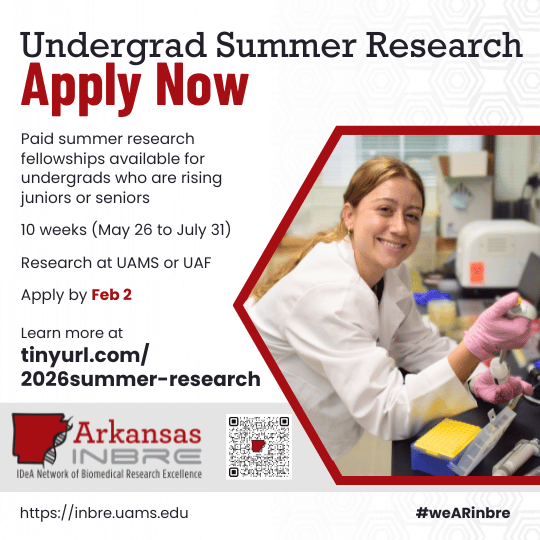Now Accepting Applications: 2026 Summer Undergrad Research Fellowships. Looking for a summer research experience? Paid two 10-week summer research fellowships – Mentored Summer Research Program and Professional Research Opportunity are available for undergrads who are rising juniors or seniors. Selected students will work on a project relevant to human health led by a faculty member at either UAF or UAMS. The scope of the projects range from lab based research to clinical studies using human subjects. Program runs from May 26 to July 31. Fellowship includes $8,000 stipend and research supply budget provided to the mentor, as well as an available travel award. Applications and all materials are due Feb 2. More