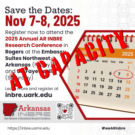 Copyright © 2024 Arkansas INBRE, All rights reserved.Questions or more info, contact Cyndy Buckhaults, Media Specialist, cbuckhaults@uams.edu Material in this newsletter is supported by a grant from the National Institutes of Health National Institute of General Medical Sciences (5P20GM103429). Any opinions, findings, conclusions or recommendations expressed in this material are those of the AR INBRE Program and do not necessarily reflect the views of the NIH.