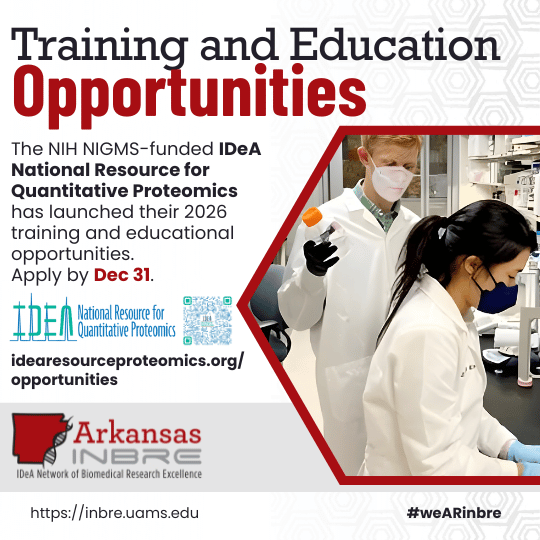 All Expense Paid Opportunities with the IDeA National Resource for Quantitative Proteomics The National Resource has opened their applications for their all expense paid opportunities for 2026. These opportunities are available for researchers nationwide and include onsite workshops and internships to learn more about quantitative proteomics. In addition, we have a voucher program that can help defray the cost of your proteomics project. Apply by Dec 31.