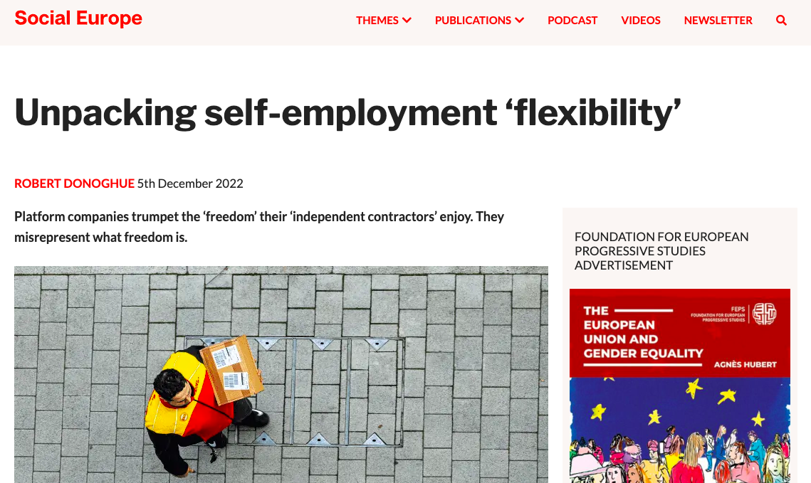 Unpacking self-employment 'flexibility' Robert Donoghue writes in 'Social Europe' on his research on 'flexibility' in the gig economy, finding that in practise there are key constraints to working flexibly.