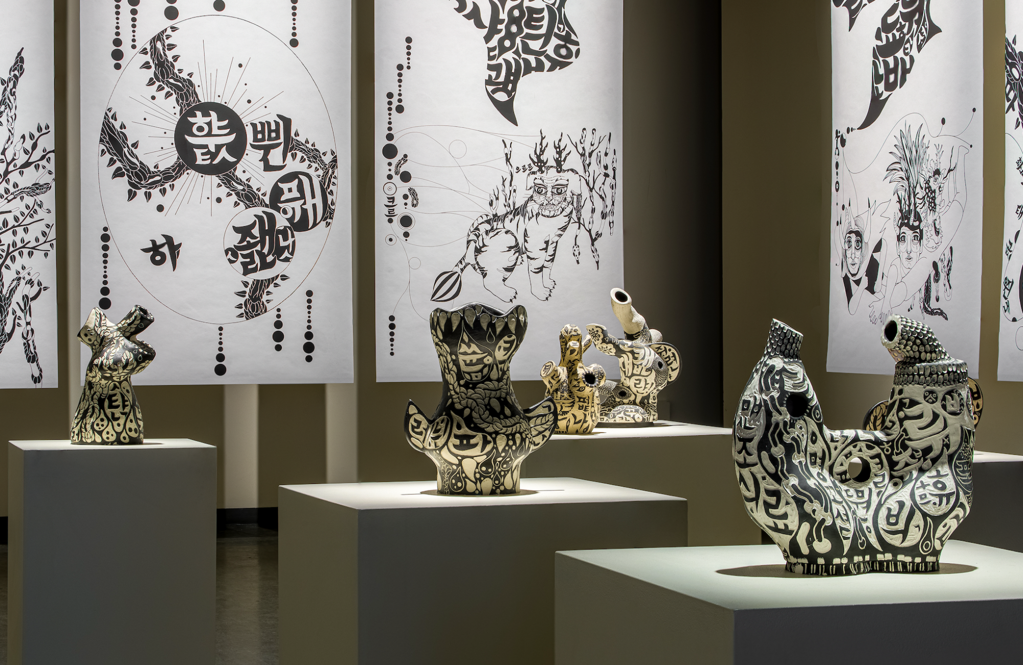 Check out our current exhibition 'Breathing Words | 날숨' by Jongwook Park! Upon immigrating to Canada in his thirties from South Korea, Jongwook Park strived to develop his artistic vision rooted in his cultural background, while also embracing the connections he made in his new environment. By blending traditional Korean folk art, modern graphic novel aesthetics, and scattered Korean alphabets as migration patterns and portable ornamentation, Park delves into the complexities of fragmentation and questions cultural expectations. In 'Breathing Words | 날숨', Park designs transitional spaces that underscore the flexibility of human nature through flat, dimensional, and rigid forms. By employing diverse mediums and structures, he desires to create visual nuances that emerge when navigating between his native language and acquired languages (French and English), which involves understanding social customs, cultural subtleties, and the art of negotiation while also reflecting on his own cultural background. As Park explains, “As someone more proficient in visual language than verbal language, I aim to visually capture the emotional and psychological complexities of my immigrant journey that revolve around communication.” BioJongwook Park, an artist who moved to Canada from South Korea, earned an MFA in Communication Design from Sangmyung University in Seoul and a diploma in Animation Art and Design from LaSalle College in Montreal. Park utilizes his continuous exploration of his cultural background to connect his immigrant journey, utilizing drawings as a thinking hat. His challenges with acquiring new languages as an adult immigrant have led him to reflect on the impact of language on personal identity.