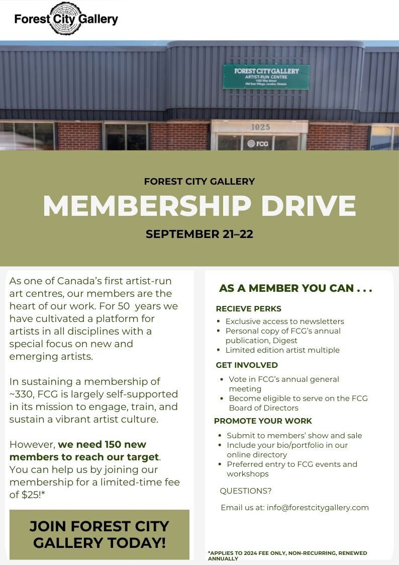 Participate in the Upcoming FCG Membership Drive this weekend!Participate in our upcoming membership drive from September 21-22 for a limited-time fee of $25!* Forest City Gallery prides itself on its Membership base, and we rely on the support of our Members not only to evolve as an innovative arts organization, but also to contribute to London’s vibrant art community. In becoming Member of FCG, you are directly supporting FCG's mandate and artistic autonomy. FCG Members benefit from: -Voting rights at FCG's Annual General Meeting -Eligibility for election to the Board of Directors -Participation in the annual Members’ Show & Sale Fundraiser exhibition -Specialized access to our new Media Collaboratory with media technology and software -Members-only digital newsletters and bulletins, in addition to our public newsletter -Your bio, work, online portfolio and contact information listed in our Members Directory -Preferred entry to workshops, networking events, and on-site and virtual crit groups, and discounts on tickets and beverages -Digital copies of FCG's DIGEST Anthology -FCG’s commissioned and limited edition artists' multiples by Wyn Geleynse and Jason Dickson. *applies to 2024 fee only, non-recurring, renewed annually