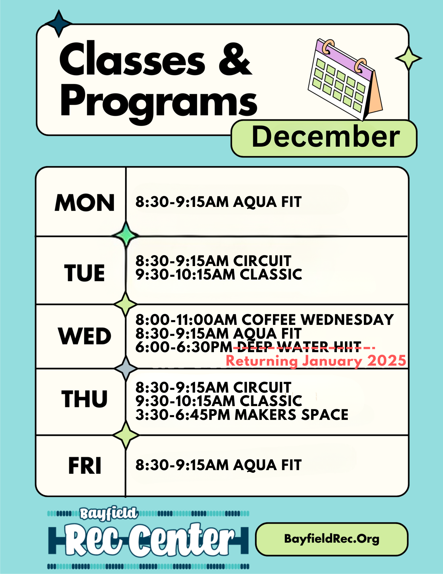 We close due to weather conditions at the discretion of our staff. If the Rec Center is closed, all programming will be canceled. 24 Hour Access will remain open to the best of our ability. Check our