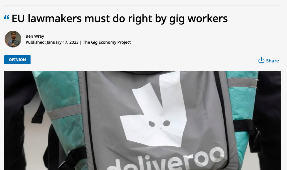 EU lawmakers must do right by gig workers Gig Economy Project co-ordinator Ben Wray writes in Reuters' "Context" section making the case for a strong presumption of employment status in the EU's Platform Work Directive.