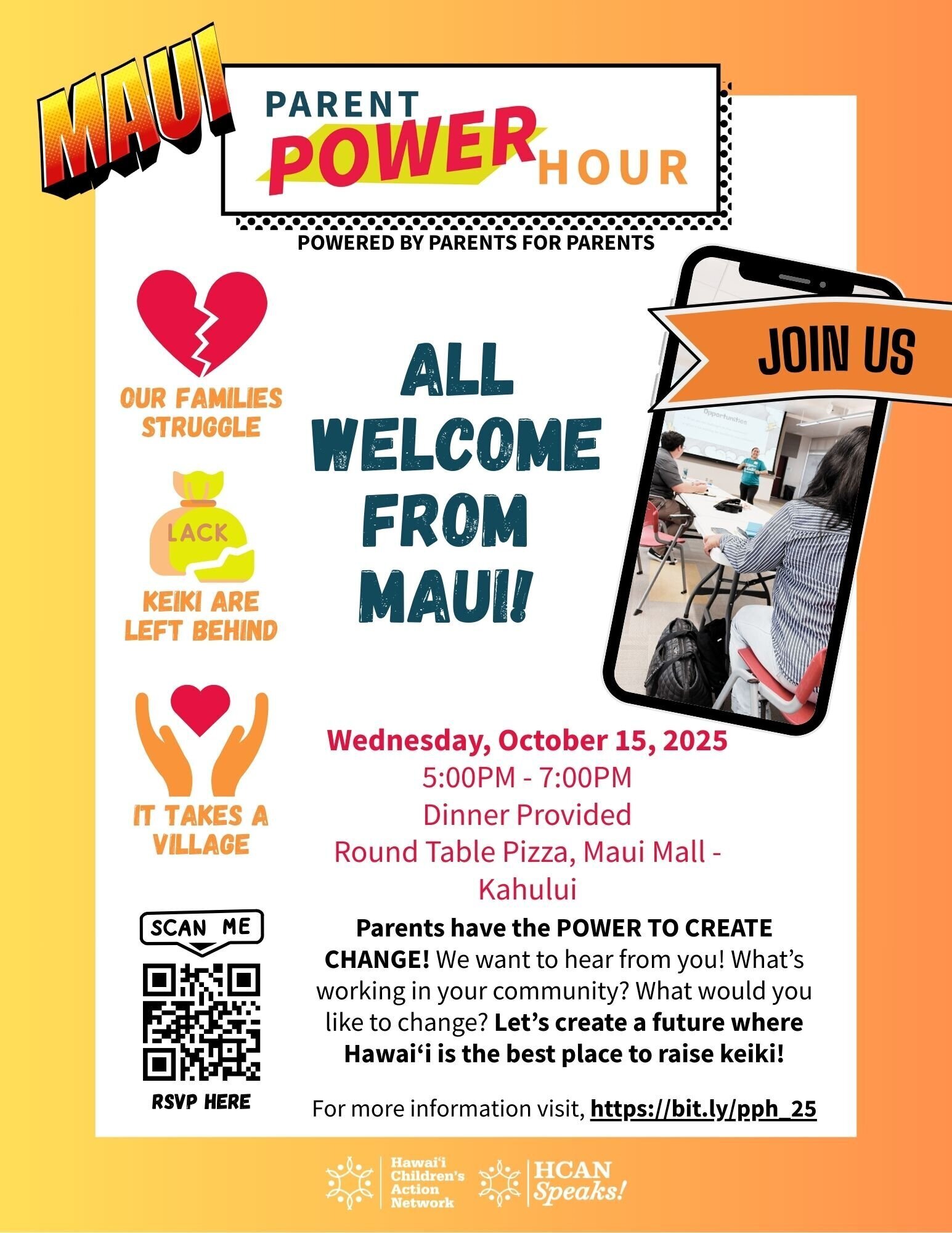 Parent Power Hour Hosted by HCAN Oct 15 Hawaiʻi Children's Action Network is hosting Parent Power Hour around the state to hear from parents about their community strengths and concerns. Wednesday Oct 15th, 5 - 7pm at Round Table Pizza in Maui Mall, Kahului. RSVP Here