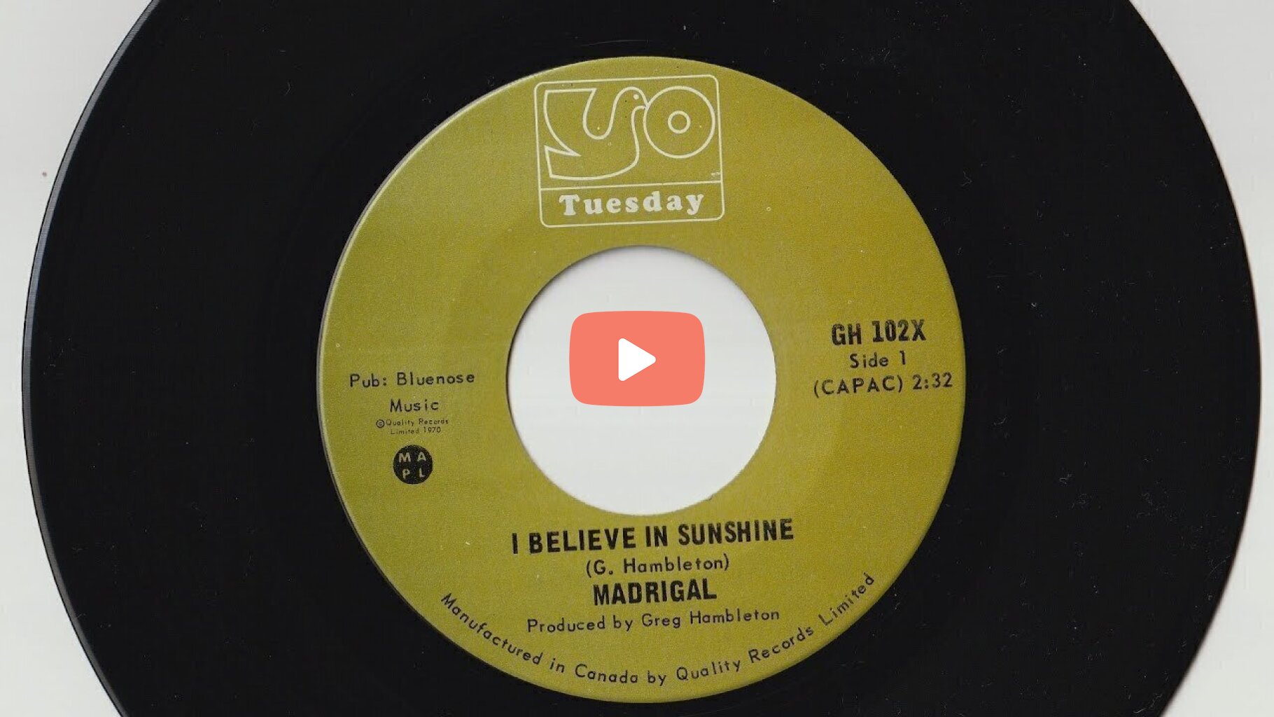 On 1 July 1970 (Canada Day), Madrigal recorded “I Believe In Sunshine” b/w “Lady” at Sound Canada Studios. By September, it started to chart nationally to become one of Canada's most successful singles of the year - still heard today on oldies radio.