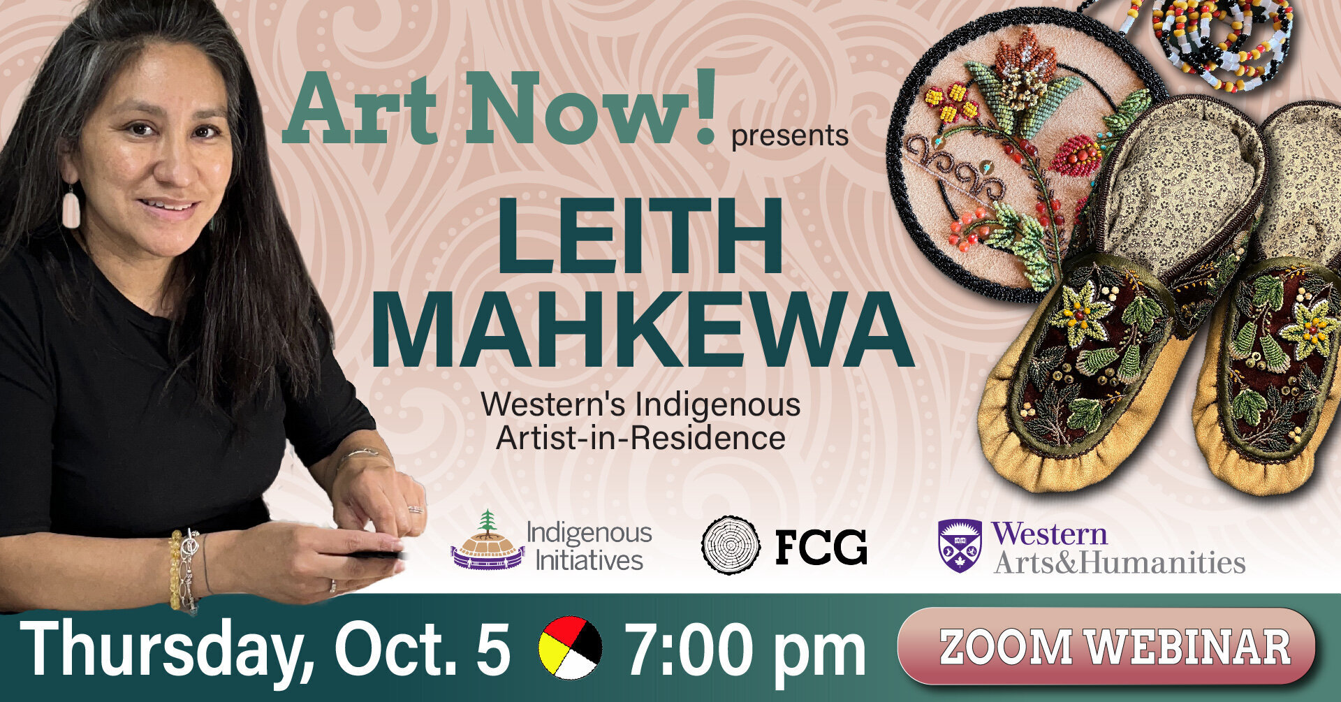 In partnership with the Forest City Gallery, the Art Now Series is pleased to present an artist talk by Leith Mahkewa, Indigenous Artist-in-Residence in the Department of Visual Arts at Western University. Master beadwork artist Leith Mahkewa is currently based in Kanien’kehá:ka (Mohawk) Territory of Kahnawake (Quebec), where she lives with her husband and four children. Mahkewa’s roots are through the Oneida Nation of the Thames. She has been creating beadwork for over 16 years. She tends to create pieces mainly in the Iroquois raised beadwork style and is moving towards incorporating more Hopi imagery into her creation to honour her father's family. As the incoming Indigenous Artist-in-Residence at Western, Mahkewa will talk about her art practice, which often juxtaposes the geometric shapes found in her Hopi family pottery patterns and Haudenosaunee inspired floral designs. The complexity of both cultures and design styles, when combined, create a one-of-a-kind form of beadwork. Her talk will also offer an opportunity to talk about her vision for her tenure as the Artist-in-Residence. Register to join us online!Event Facebook page, via Public Humanities at WesternThe Art Now Speakers’ Series is free and open to the public. This talk is generously supported by The Faculty of Arts and Humanities, Indigenous Initiatives at Western, and the Public Humanities at Western.
