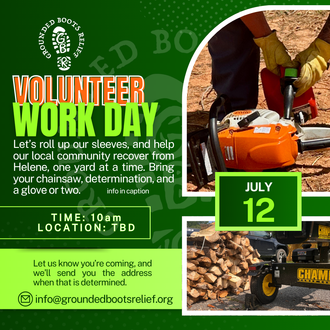 Location TBD – Email us at info@groundedbootsrelief.org to be notified once location and weather are confirmed. (Keep an eye on your spam folder too) Time: 10am - ?