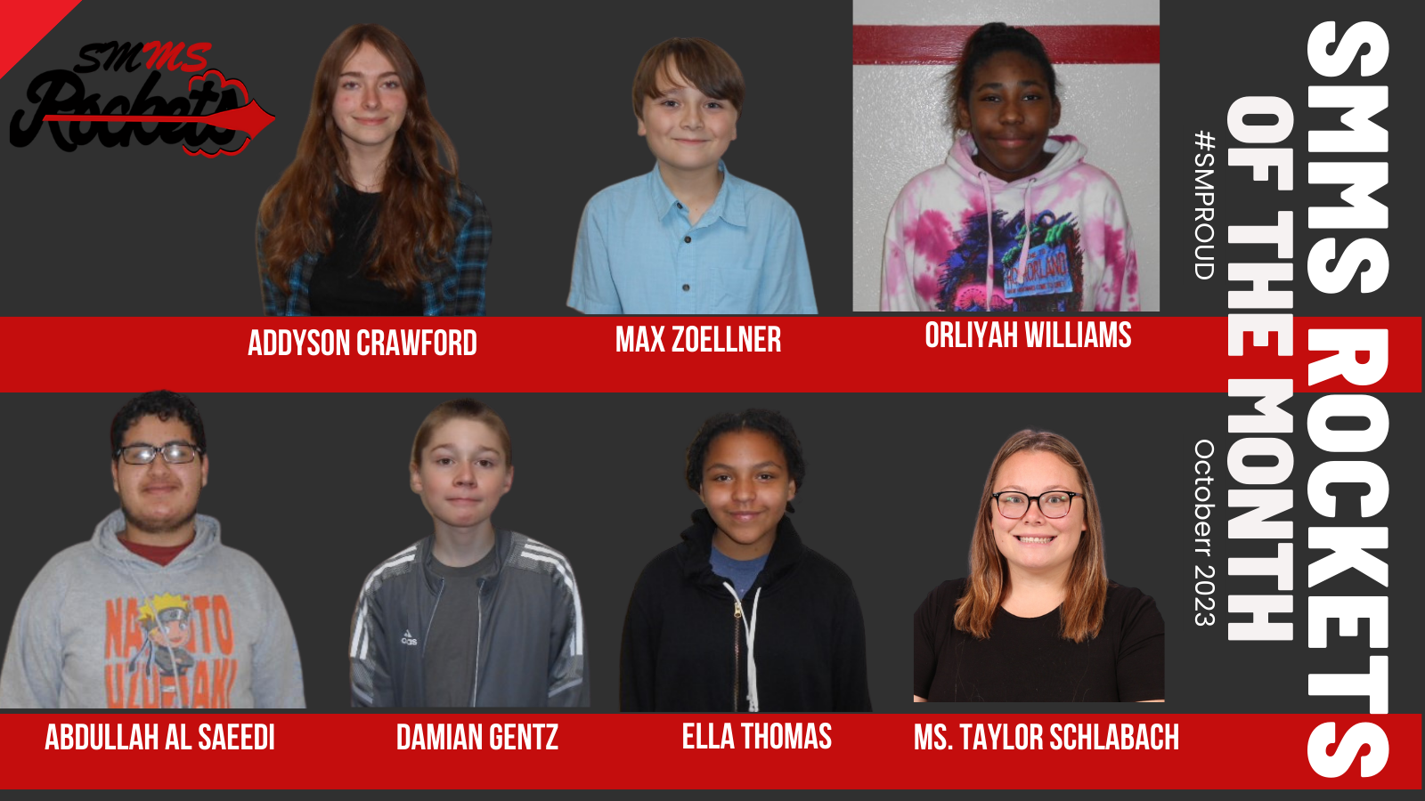 Each month at the middle school administrators, classroom teachers and office staff select students from Grades 6-8 to be honored as Students of the Month. These students are chosen on the basis of their active commitment at school to the principles of the SM Way----Respect, Kindness, Responsibility, Honesty and Perseverance. Distinguished winners for the Month of October are: