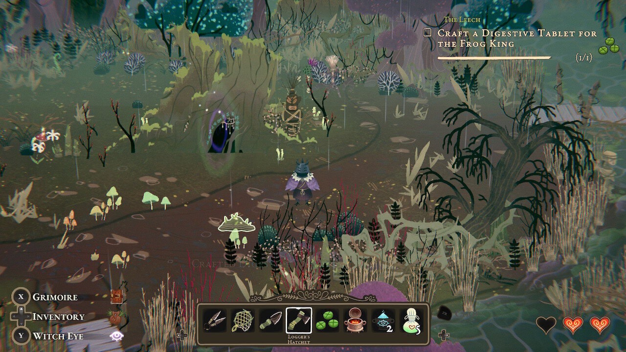 I found a game called Wytchwood, where I play as an old crone of a witch with a pot for a head/helmet who wanders around collecting souls for some old goat I found in my yard. I need to help him so I can figure out the mystery of a sleeping maiden that I can't seem to remember anything about. (Side note: I'm pretty sure I'm the sleeping maiden, and somehow I made a bad deal with the goat so I'm in some sort of magically-induced coma until my witch-self can save me...or something along those lines.)