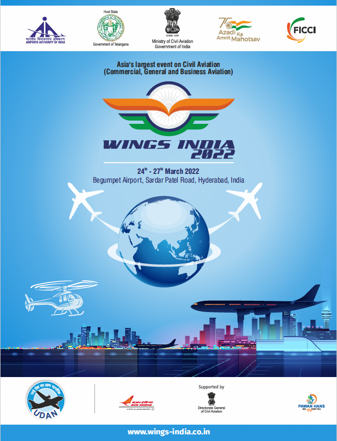 ‘Wings India 2022’ - a flagship event on Civil Aviation Sector is scheduled from March 24th - 27th, 2022 at Begumpet Airport, Sardar Patel Road, Hyderabad, India. We are confident that your company will be enriched by the immense working networking opportunity in the presence of Policymakers, Government Officials, Technology Experts, Buyers, and Business Partners.
