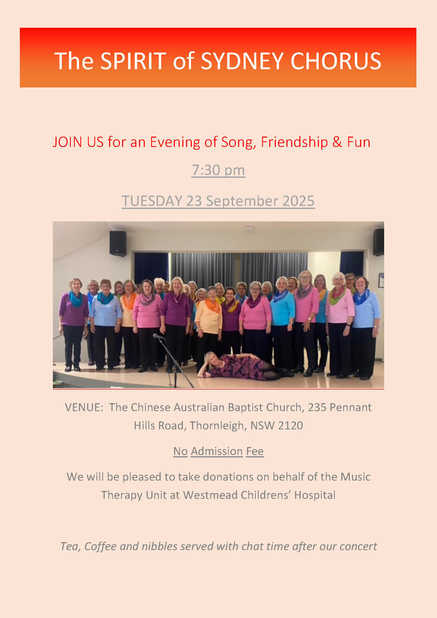 We gratefully acknowledge the Spirit of Sydney Chorus for once again presenting their annual Family and Friends Evening in support of Music Therapy at the Children’s Hospital at Westmead.