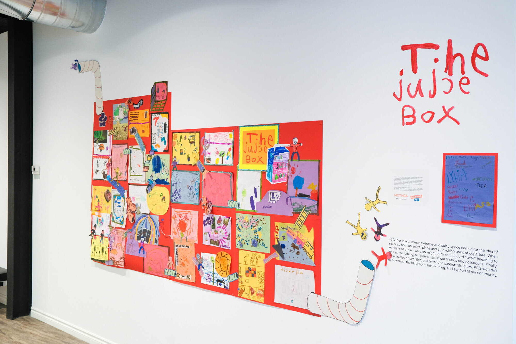 Drop by and check out The Juice Box on display until March 1st, a collaborative art exhibit by artist-caregivers and their children depicting a fantasy art space using collage and mixed media.