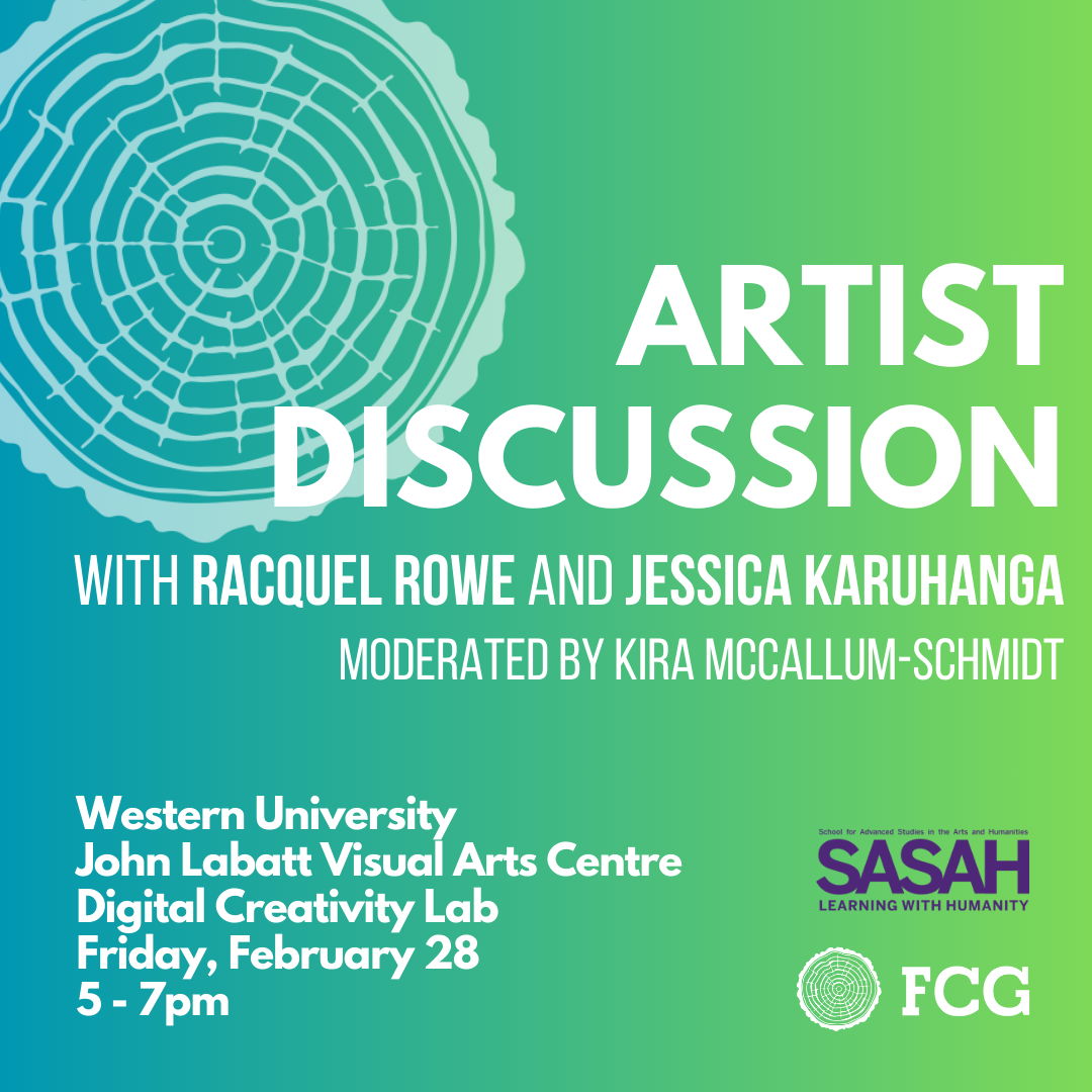 Save the date! Join us for the upcoming artist panel discussion between artists Racquel Rowe and Jessica Karuhanga, moderated by Kira McCallum-Schmidt in partnership with the School of Advanced Study in Arts and Humanities (SASAH) program at Western University.