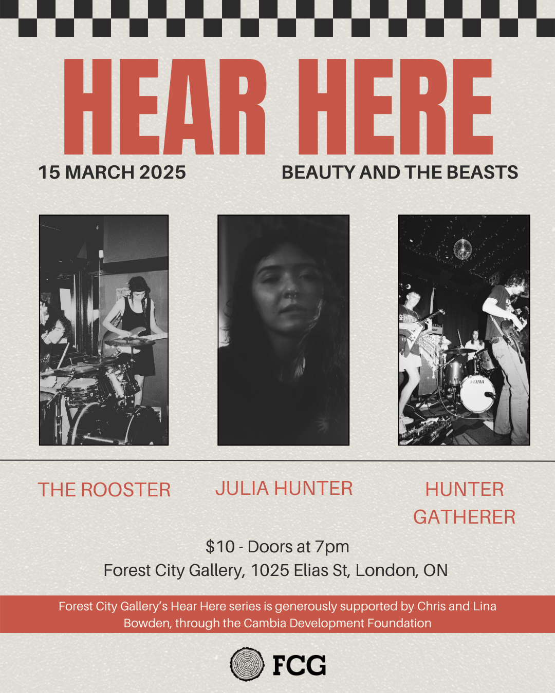 Our mailing address is:1025 Elias Street London, Ontario, N5W 3P6 Canada FCG's programs and exhibitions are free and accessible to all thanks to the generous support of the Canada Council for the Arts, Ontario Arts Council, London Arts Council, and the London Community Foundation. We are grateful to our artists, members, volunteers, donors, and community partners. Our operations rely on your generous and dedicated support. Please consider becoming a member of FCG.For information on our programming, or for other general inquiries please contact the gallery at info@forestcitygallery.com Copyright © 2025 Forest City Gallery. All rights reserved.You received this email because you subscribed to our list. You can unsubscribe at any time.