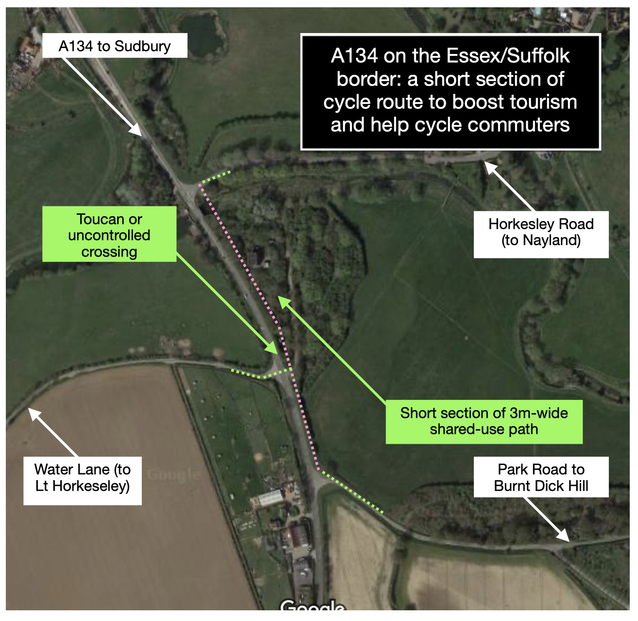 News from outside the city. Will Bramhill, the campaign secretary, took to the Stoke by Nayland page on Facebook to float an idea for a short section of path for cyclists, walkers and horse riders beside the A134 between Horkesley Road, Nayland, and Park Road, Boxted, with an uncontrolled crossing to Water Lane, Little Horkesley.