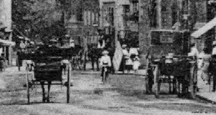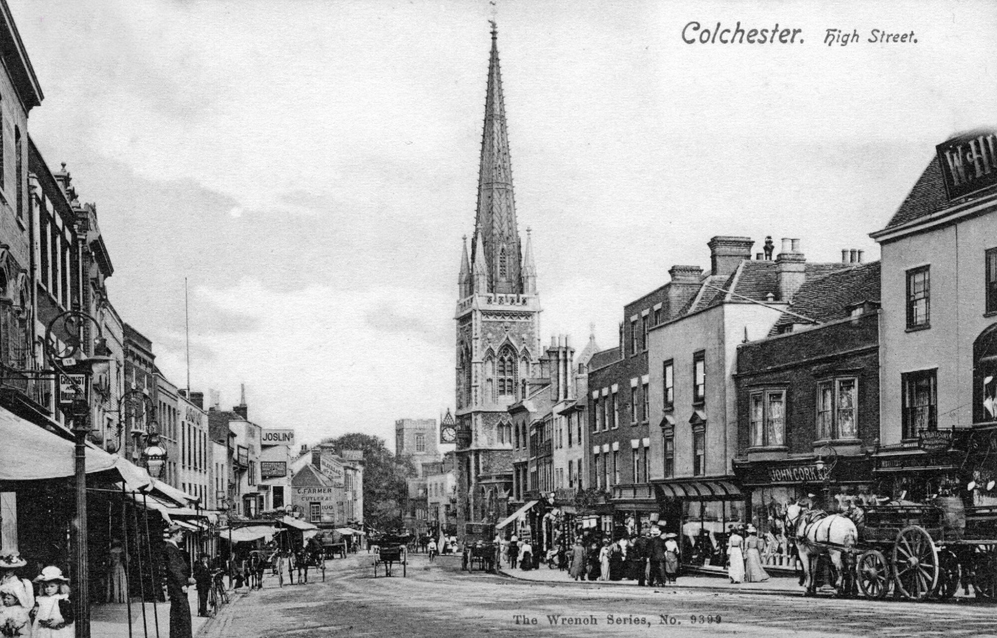 Your editor writes: "At first I thought this was a picture of Colchester High Street with no cyclists. I had to look closely and sure enough there are a couple of bikes propped against the kerb near the George Hotel, while in the far distance a woman in her Edwardian best is storming between two carts towards the cameraman (detail, below). If you're new to Colchester the church is St Nicholas's, which was built in the 1870s on the site of a 12th-century church, and demolished in the 1950s. One of the bells went to St Martin's church in Basildon, and the former graveyard is currently being redeveloped as St Nicholas Square."