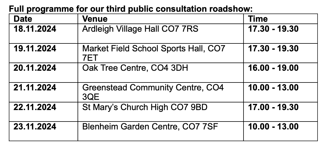 Clarion Housing Group has invited Colcheter Cycling Campaign members to take part in the third round of community consultation on the proposals for the Salary Brook Garden Community, between Greenstead and Elmstead Market. Roadshow times and dates are above.Consultation materials will be available on the web from November 18 or you can email latimer@connectpa.co.uk or call the project freephone on 0800 029 7171. A final consultation is planned for early 2025 and the responses will form part of the eventual planning application.