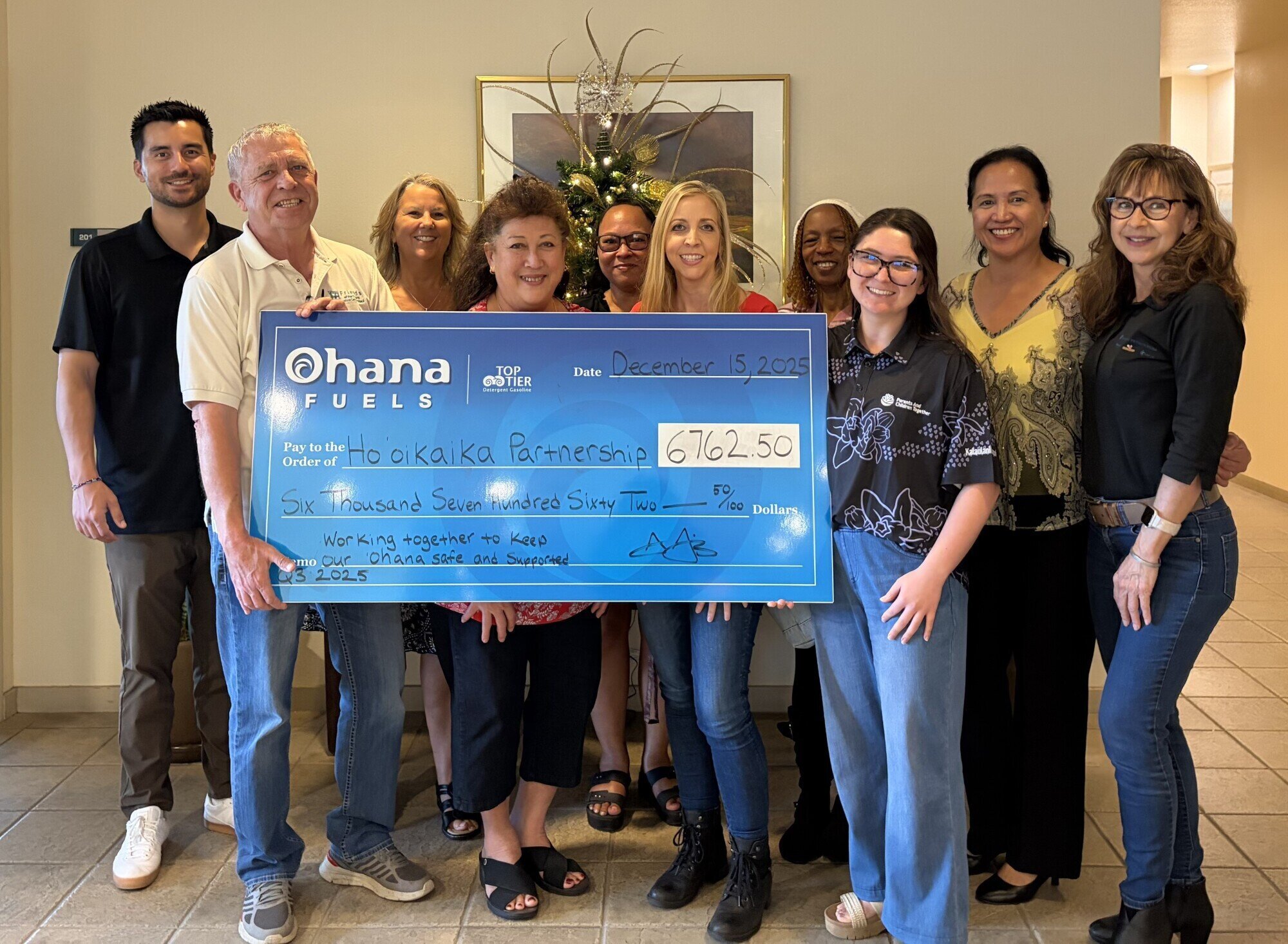 ʻOhana Fuels presented a check to Hoʻoikaika Partnership on Monday, December 15, at the Hawaiʻi Petroleum office, celebrating funds raised through the “ Fuel up. Do good.™” program and two community car wash fundraisers held this past summer. From July through September 2025, Maui residents contributed $6,027.60 to Hoʻoikaika Partnership simply by filling up their tanks at ʻOhana Fuels stations. An additional $1,280.00 was raised through two car washes hosted by Hoʻoikaika partners on July 12 and August 23 at the Kahului ʻOhana Fuels/Minit Stop location on Wakea Avenue. Together, the campaign generated a total of $7,307.60 to strengthen families across Maui County. We are incredibly grateful for the generosity of ʻOhana Fuels and everyone in the community who fueled up or stopped by for a car wash!