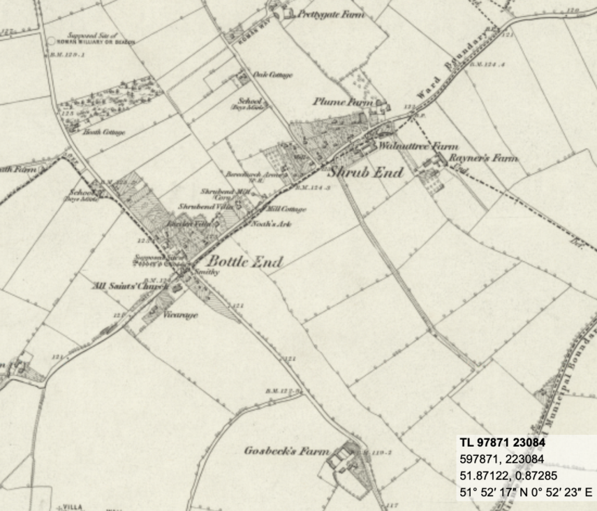 The scene is Shrub End Road, south Colchester, date unknown. A Google Maps photo of the scene today is below, You can see All Saints church tower (over the top of the trees on the left) and the pub sign is still in place. The area would have been a lot more rural then and the locality was "Bottle End" – Shrub End itself was slightly to the north. It would also have been far more peaceful to live there. The junction was the location of Pedder's Cross, mentioned by Morant the historian, that has long since vanished. It must have been gone by 1830-1840` as its "supposed site" is marked on the map below.