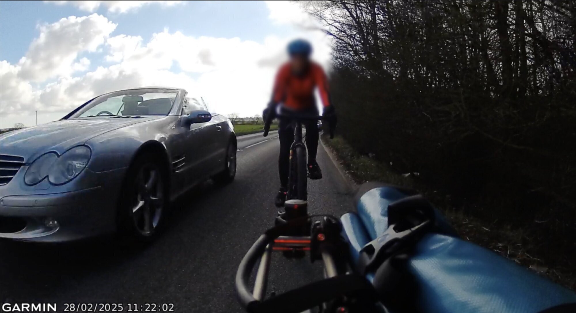Look at the space between Catherine's right hand and the Mercedes overtaking them – that's a lot less than 1.5 metres, as required by the Highway Code.