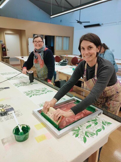 10 am - 4 pm Satur ay and Sunday The Shape of Things with Libby Noblett. At the two-day fabric screen printing workshop you will create a vibrant large swatch of your own design. The first day will be a practise and preparation day for printing a final swatch on the second day. Participants will have access to printing 4-5 colours onto their final swatch. The large fabric piece will be hung and photographed before being cut up for you to take home. By the end of the second day you will have two large fabric swatches. Whether you are a beginner or have some experience, this workshop is a great way to explore colour, pattern, texture and the magic of screen printing. Cost: $330 for 2 days includes all fabric, inks, and support. Book at