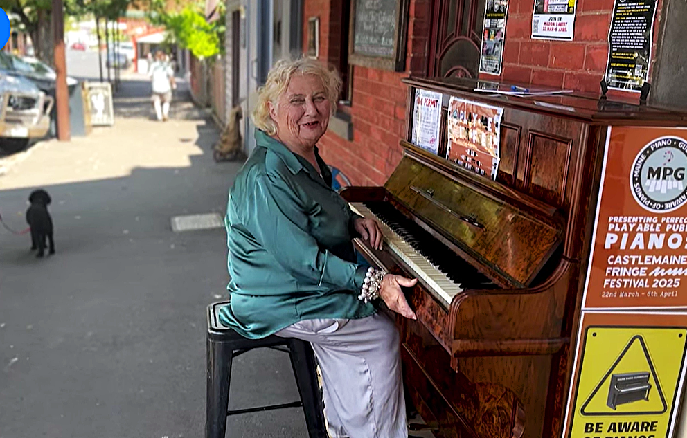 Maldon Bowls 82 High St. Playing Tuesdays, Fridays and weekends. Secretary can be contacted at (MaldonBowls@outlook.com). There’s also a monthly Community Night, sometimes barefoot (that’s party night). They also provide free training/coaching every Friday from 4.00 pm for all ages. Facebook: Maldon Bowls Club. Maldon Golf Club. Golf Links Rd. It’s $10 per round for visiting players, and golfers with handicaps are welcome to join in club events. Social golf on Mondays from 8.30am – 9 holes. Facebook: Maldon Golf Club. Enquiries maldongolf4u@gmail.com or Gay Reid 0413 013 766. Maldon Pétanque Club is fortnightly 1pm Sundays at St. Brigid’s (Chapel St, cnr Adaur St) \. Enq: Sandy Noble 0429 006 130. Social Pétanque club is 2pm fortnightly, Sundays. at the Penny School pistil 19 Church St. or further information call 0459 093 452. Pic. This is Maggie Jackson from Piano Guerrillas wowing them outside Rebecca’s bakery