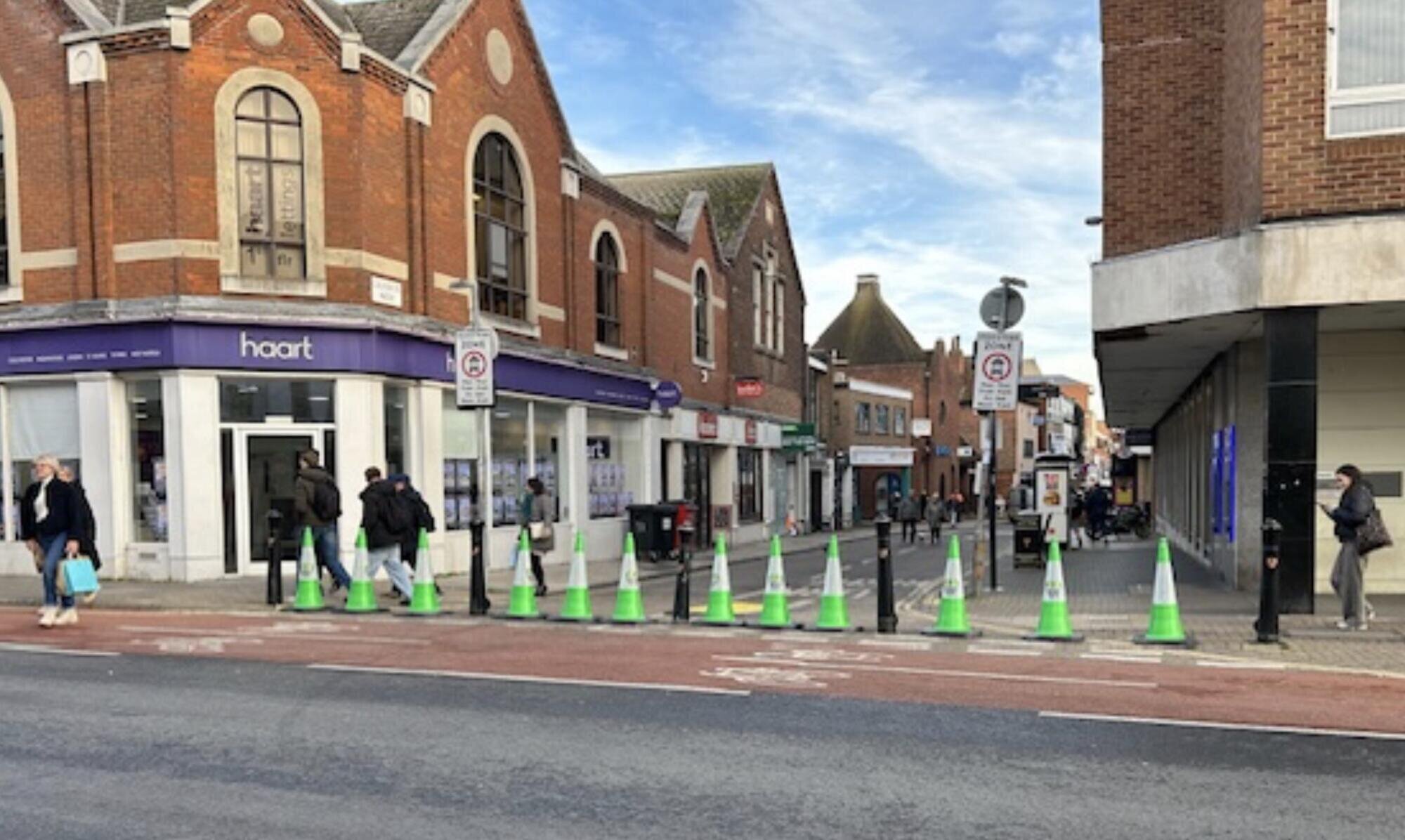 Our thanks to Colchester City Council for quickly sorting this issue at the junction of Head Street and Culver Street West. The market inspectors apparently took it upon themselves to add cones to the bollards across the junction "to stop motorbikes". After the campaign raised the matter, the cones have been spaced out to allow cyclists access – some had been riding up on to the corners of the footway to access the Head Street cycle lane.