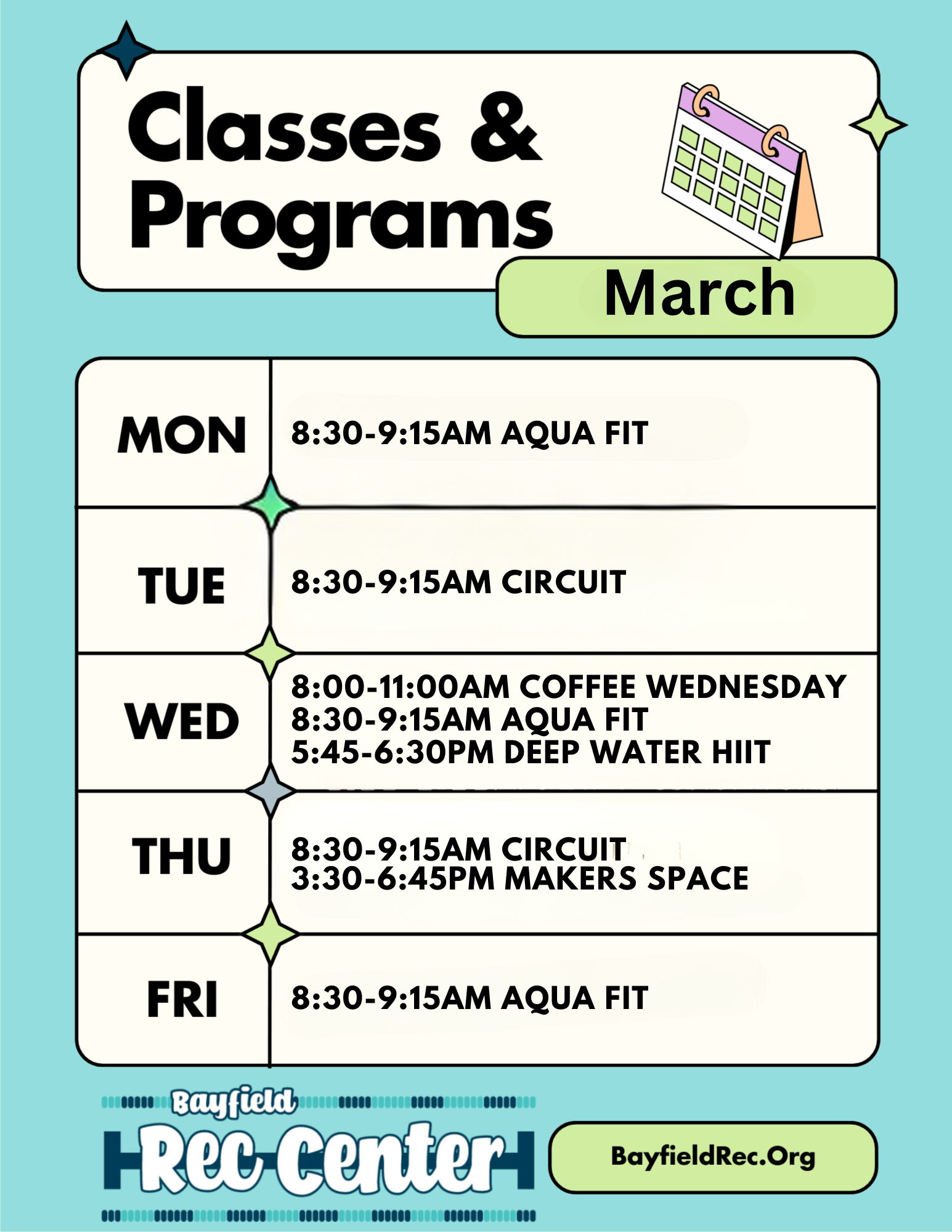 Monday/Wednesday/Friday 8:30-9:15am Aqua Fit - intermediate class in the shallow end of the pool for all working on cardio, strength, and balance.